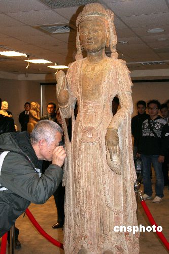 一月四日,一位觀眾在臺灣中華皇家藝術博物館近距離欣賞首次展出的該館鎮(zhèn)館之寶——國寶級文物“大勢至菩薩”石像。由該館推出的“中華瑰寶系列——宋朝漢白玉十八羅漢特展”當日在臺北開展,造型中西合壁、保存完好,被認為是全球唯一保存最完整的“大勢至菩薩”塑像也同期與觀眾首度見面。據考證,這尊高一百九十八厘米、石灰石貼金敷彩“大勢至菩薩”為東魏至北齊年間作品,距今約一千六百年至一千四百年。中新社發(fā) 孫自法 攝