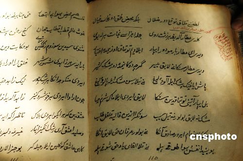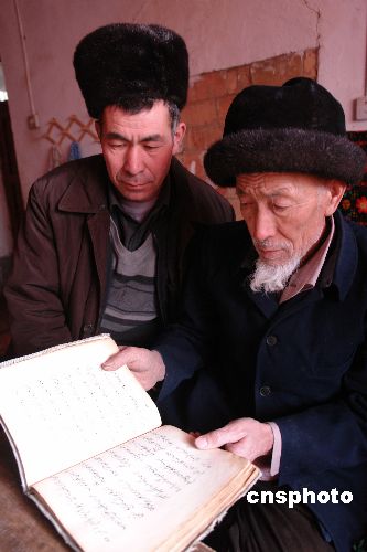 1月13日,吐魯番鄯善縣魯克沁鎮(zhèn)宗教人士在翻閱察合臺語長篇敘事詩《熱吾澤突孜左合熱》手稿。2006年新疆吐魯番地區(qū)少數(shù)民族古籍工作人員,在新疆鄯善縣魯克沁鎮(zhèn)兩位宗教人士手中,先后發(fā)現(xiàn)古西域著名維吾爾族詩人艾合買提·吾加木尼牙孜在1802年,用察合臺語(古維吾爾語)創(chuàng)作的長篇敘事詩《熱吾澤突孜左合熱》(漢譯:左合熱的文明園)手稿,和清代西域維吾爾族學(xué)者吾布勒·伊斯拉木,從波斯語翻譯為察合臺語(古維吾爾語)的抄本《麥魯麻提阿帕克》(漢譯:世界通訊)。這兩本古籍對研究古西域文學(xué)、歷史、地理和古絲綢之路文明具有重要意義。目前,這兩本古籍已經(jīng)列入國家珍貴古籍名錄。中新社發(fā) 姜浩 攝