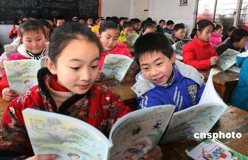 2月20日,六安市金安區(qū)人民路小學(xué)五年級(jí)學(xué)生在閱讀新課本。當(dāng)日,在經(jīng)受50年不遇暴雪災(zāi)害的大別山老區(qū)安徽省六安市,各中小學(xué)校的學(xué)生們領(lǐng)到新課本,如期開學(xué)上課。雪災(zāi)發(fā)生后,當(dāng)?shù)攸h委、政府采取多種措積極施維修雪毀校舍,嚴(yán)格執(zhí)行收費(fèi)政策,免去城區(qū)學(xué)生的學(xué)雜費(fèi)和部分下崗特困戶子女的課本作業(yè)費(fèi),農(nóng)村學(xué)生費(fèi)用全免,保障災(zāi)后教學(xué)工作正常進(jìn)行。中新社發(fā) 陳超平 攝