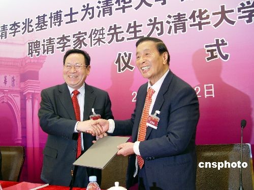 圖為在受聘儀式上,清華大學校長顧秉林院士(左)親手為李兆基頒發(fā)聘書。