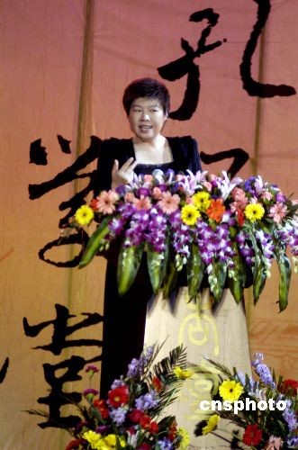 2008年4月5日晚,著名學(xué)者、北京師范大學(xué)教授于丹來到山東曲阜,作為剛剛開設(shè)的“孔子學(xué)堂”首位主講人登上杏壇的講臺。“孔子學(xué)堂”是曲阜市與中華書局面向廣大普通游客和公眾開設(shè)的文化大型講座。今后每年的4月到10月,每月都將邀請一名專家主講,一名專家現(xiàn)場點(diǎn)評,通過和聽眾的問答互動,旨在弘揚(yáng)儒學(xué)經(jīng)典文化。中新社發(fā) 張侃 攝