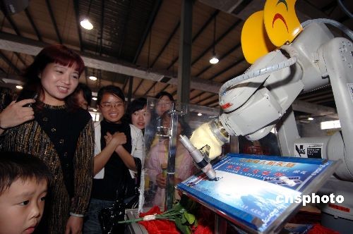 四月八日,一個高科技機(jī)器人在福州航天展上為觀眾簽名。當(dāng)日,中國載人航天實(shí)物展在福州金山展覽城開幕,“神舟五號”運(yùn)載火箭逃逸塔、整流罩等用于實(shí)驗(yàn)的航天實(shí)物首次亮相福州。中新社發(fā) 王東明 攝