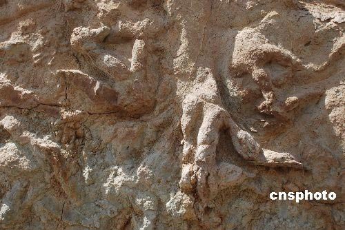 中德古生物學家4月10日宣布,日前在中國新疆吐魯番盆地鄯善地區(qū)侏羅紀地層中首次發(fā)現一批恐龍足跡化石。目前已發(fā)現恐龍足印150余個,分布范圍長達100余米,這批恐龍生活在距今約1.65億年前的侏羅紀中期,身長約5至6米,屬于群居小型肉食類恐龍。 至少包括兩種類型,均屬于肉食性的獸腳類恐龍。 此次鄯善地區(qū)恐龍足跡化石的發(fā)現,在新疆尚屬首次。它填補了新疆地區(qū)恐龍足跡研究的空白。中新社發(fā) 緱燁 閆軍 攝