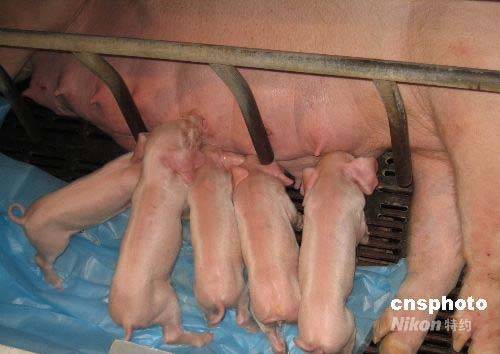 五月十七日上午,廣東省首例體細胞五頭克隆豬,在云浮新興縣廣東溫氏食品集團有限公司水臺原種豬場集體亮相。十五日下午克隆豬誕生,其中最重的一只克隆豬為一點九公斤,一胎產(chǎn)下五頭存活“克隆豬” 為國內(nèi)之最。該“克隆豬”是溫氏集團與中國農(nóng)業(yè)大學(xué)、華南農(nóng)業(yè)大學(xué)合作的成果,填補了該省在該領(lǐng)域的空白,也是繼北京、黑龍江、上海、廣西等地之后,在中國大陸第五個擁有體細胞克隆豬的省份,是國內(nèi)率先開展體細胞克隆豬研究的企業(yè)。中新社發(fā) 黃耀輝 攝