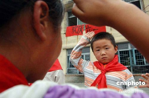 圖為在帳篷小學(xué)開學(xué)典禮上,一名小學(xué)生光榮的加入了少年先鋒隊(duì)。