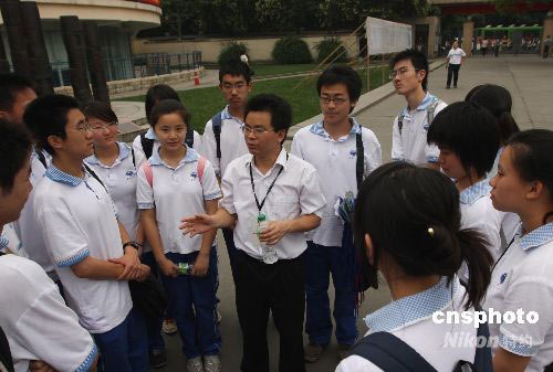 圖為成都七中考點(diǎn)的邱老師在給考點(diǎn)疏散志愿者講解注意事項(xiàng)。