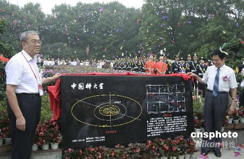 9月20日,在中國科技大學(xué)東區(qū)郭沫若廣場上隆重舉行科大五十年校慶日升旗暨“中國科大星”紀(jì)念碑揭幕儀式,為學(xué)校五十華誕獻(xiàn)上第一份祝福。2007年元月,國家天文臺研究決定,選定編號為19298這顆于1996年9月20日即科大校慶日發(fā)現(xiàn)的小行星命名為“中國科大星”。之前,內(nèi)地以高等學(xué)校名稱命名的小行星只有4顆,分別是“北京大學(xué)星”、“南京大學(xué)星”、“北京師范大學(xué)星”和“山東大學(xué)星”。圖為中科院黨組成員、校黨委書記郭傳杰(左)和龔惠興院士(右)共同為“中國科大星”紀(jì)念碑揭幕。中新社發(fā) 張婭子 攝