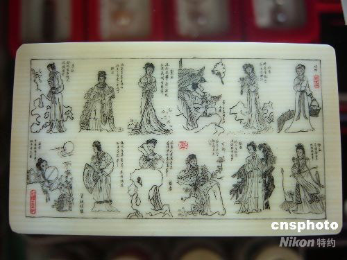 9月21日,象牙微雕《金陵十二釵》作品亮相蘇州。當(dāng)日,蘇州民間藝人郭克杰耗時(shí)近一個(gè)月創(chuàng)作完成的象牙微雕《金陵十二釵》作品展示在人們面前,十二位人物造型栩栩如生。該微雕作品長4.8厘米,寬2.5厘米。中新社發(fā) 李俊鋒 攝