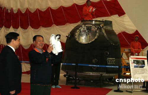 10月1日上午,神舟七號(hào)載人飛船返回艙在其誕生地——中國(guó)航天科技集團(tuán)公司所屬中國(guó)空間技術(shù)研究院舉行開(kāi)艙暨搭載物交接儀式,伴隨三位中國(guó)航天員太空飛行六十八小時(shí)二十七分鐘的一批特殊“乘客”一一精彩亮相,隨后各歸其主。圖為中國(guó)載人航天工程航天員系統(tǒng)總指揮兼總設(shè)計(jì)師、中國(guó)航天員科研訓(xùn)練中心主任陳善廣展示將由該中心珍藏、首次成功使用過(guò)的“飛天”艙外航天服手套。中新社發(fā) 孫自法 攝
