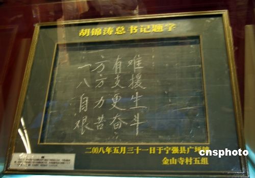 10月9日,在北京軍博舉辦的“萬眾一心 眾志成城”抗震救災(zāi)主題展上展出了胡錦濤總書記在陜西省漢中市寧強(qiáng)縣金山寺村察看災(zāi)情、檢查指導(dǎo)抗震救災(zāi)工作和慰問災(zāi)區(qū)的孩子們時(shí),在一間用帳篷搭建的臨時(shí)教室里,在小黑板上寫下的“一方有難 八方支援 自力更生 艱苦奮斗”的題詞。中新社發(fā) 九州 攝