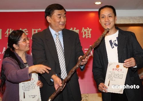 著名演員馮遠(yuǎn)征(右)在北京華僑飯店向中國華僑歷史博物館捐贈(zèng)百年木雕龍人頭拐杖,中國僑聯(lián)副主席李祖沛(中)接受捐贈(zèng)藏品。