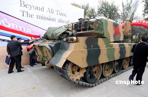 10月28日,一輛軍綠色、價值300多萬元的“消防坦克”亮相2008北京國際消防設備技術交流展。據(jù)悉,消防坦克是由中國軍用坦克改裝而成的。它采用特種裝甲鋼板制成,自重大約35噸,裝配有直流有線電控自動炮、高壓水泵、可燃和有毒氣體探測儀及防火直流照明燈,馬力很大,最高時速可達70多公里。中新社發(fā) 吳芒子 攝
