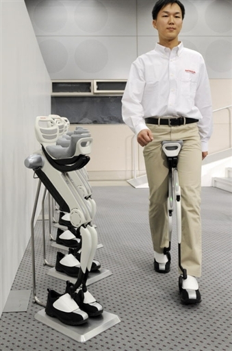 11月7日,記者在日本一公司位于東京的總部,試用該公司研制的一種步行輔助裝置。該裝置僅重6.5公斤,由一個(gè)鞍座、兩條腿狀支架和鞋子組成。設(shè)計(jì)者稱,該裝置可用來幫助老年人爬樓梯或者減輕在裝配線前工作的工人的勞動(dòng)強(qiáng)度。