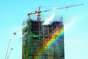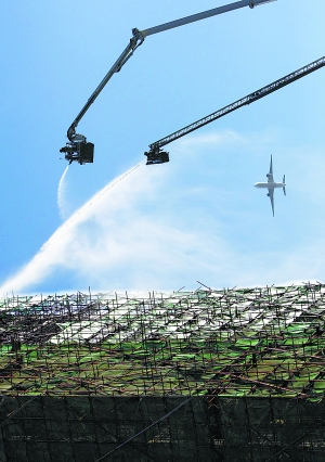 下午3時(shí),站在該樓西南側(cè)的日新路上能看到,全樓16層至20層外圍腳手架上的綠色防塵罩已在大火中化為灰燼。盡管兩條水柱正從離地60余米高的云梯上朝著樓內(nèi)猛烈噴射,但是由于風(fēng)大吹歪了水柱,高空的水霧甚至在晴空下形成了兩道彩色長虹。
