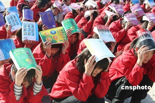 11月25日上午11時,位于河北邢臺的中國二十冶技校舉行一次應對地震、火災等突發(fā)事件的“逃生”演習。在短短的1分鐘內,該校300余名師生順利“逃生”。中新社發(fā) 陳雷 攝