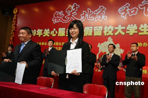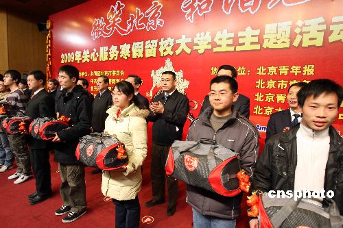 一月十日,北京啟動(dòng)“微笑北京 和諧社會(huì)”關(guān)心服務(wù)寒假留校大學(xué)生主題活動(dòng),其主要內(nèi)容包括關(guān)心地震災(zāi)區(qū)、邊遠(yuǎn)地區(qū)和經(jīng)濟(jì)困難大學(xué)生,提供見(jiàn)習(xí)崗位,幫助同學(xué)們利用寒假進(jìn)行就業(yè)創(chuàng)業(yè)見(jiàn)習(xí)。為留校學(xué)生贈(zèng)送兩千個(gè)愛(ài)心大禮包。中新社發(fā) 任海霞 攝