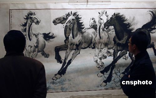 3月10日,“中國現(xiàn)代美術(shù)奠基人系列展·徐悲鴻大型藝術(shù)展”在北京炎黃藝術(shù)館舉行,一幅著名的國畫作品《群奔》吸引參觀者目光。本次展覽由北京市文化局、徐悲鴻紀(jì)念館和炎黃藝術(shù)館聯(lián)合主辦,共展出80多件徐悲鴻真跡,涵蓋了徐先生各個時期的代表作,其中包括他早期的素描《馬與馬夫》、《女人體》、《自畫像》等。中新社發(fā) 鄭雄增 攝
