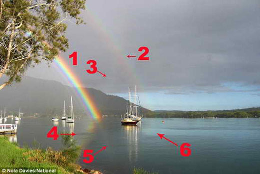 人們幾乎看不清楚第六道彩虹,但是考利博士堅(jiān)持稱,如果你認(rèn)真看,你就能看到第六道彩虹。他說(shuō):“諾拉的照相機(jī)只拍到了第六道彩虹(圖示6)的部分,它是河面的一次反射,雨滴內(nèi)的兩次反射形成的。由于進(jìn)行了多次反射,其顏色被擴(kuò)散出去,它的外貌僅依稀可見(jiàn)!