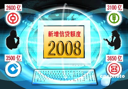 1月14日消息:央行核定了工商銀行(601398,1398.HK)、建設銀行(601939,0939.HK)、農(nóng)業(yè)銀行2008年的新增信貸額度,分別為3650億元、3500億元、3100億元,均與2007年基本持平,中國銀行核定的新增信貸額度為2600億元,比2007年的2800億元減少了200億元。中新社發(fā) 呂建設 攝