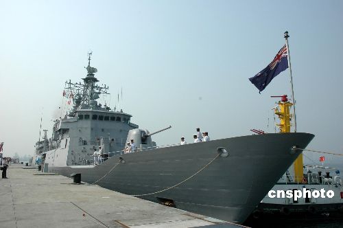 10月19日上午10時,新西蘭海軍“特卡哈”(Te Kaha)號護(hù)衛(wèi)艦(舷號F77)在新西蘭海上聯(lián)合作戰(zhàn)部隊司令大衛(wèi)·安森(David Anson)準(zhǔn)將的率領(lǐng)下,駛抵中國海軍湛江軍港,開始對南海艦隊進(jìn)行為期3天的友好交流。中方南海艦隊副參謀長么志樓少將在碼頭舉行儀式,歡迎新艦首次訪問湛江。中新社發(fā) 李根成 攝