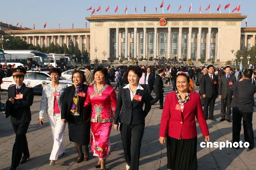 中國共產(chǎn)黨第十七次全國代表大會10月21日上午在北京人民大會堂閉幕,圖為新疆代表團的各族代表走出會場。中新社發(fā) 任晨鳴 攝