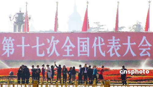 10月21日,中國(guó)共產(chǎn)黨第十七次全國(guó)代表大會(huì)在北京人民大會(huì)堂勝利閉幕。一些大會(huì)工作人員在天安門廣場(chǎng)留影。中新社發(fā) 鄭雄增 攝