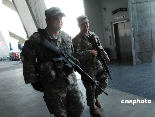 全副武裝的士兵在聖地牙哥高通體育館臨時(shí)避難場巡邏。