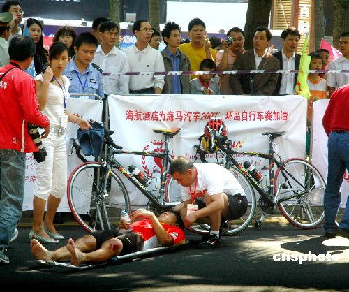 圖:環(huán)海南公路自行車(chē)賽 記者與三賽手相撞(2)