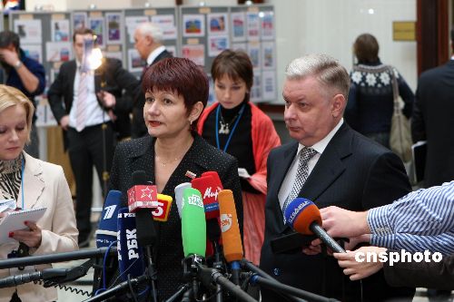 圖為俄中選委成員安娜·庫利亞索娃和俄聯(lián)邦移民局官員康斯坦丁·羅莫丹諾夫斯基,向媒體介紹國(guó)家杜馬選舉的進(jìn)展情況。