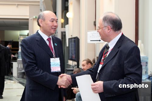 圖為哈薩克斯坦議會(huì)副議長(zhǎng)、獨(dú)聯(lián)體國(guó)家議會(huì)組織觀察團(tuán)協(xié)調(diào)人茹馬古洛夫(左),會(huì)見俄中央選舉委員會(huì)成員。