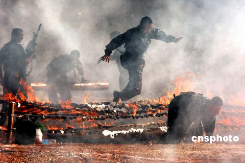圖為中國士兵穿越火障。