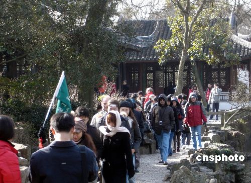 12月30日,游客在蘇州古典園林拙政園游覽。當日是2008年元旦“小長假”第一天,盡管蘇州天氣寒冷,但姑蘇園林內(nèi)人氣依然火爆。中新社發(fā) 王建康 攝