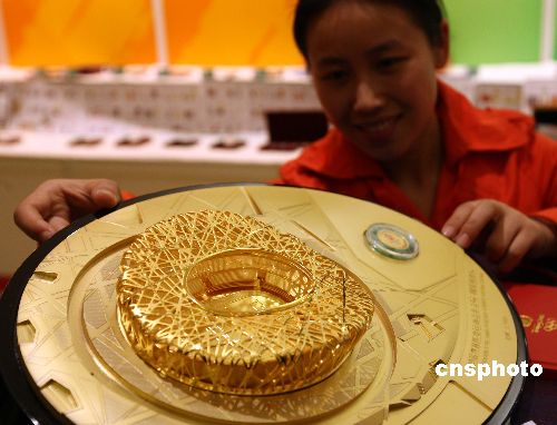 一月五日,北京奧組委推出七十余款?yuàn)W運(yùn)貴金屬特許商品新品,其中包括常規(guī)鍍金銀類(lèi)產(chǎn)品、金銀類(lèi)產(chǎn)品及珍藏系列金銀、金玉新工藝紀(jì)念章等。這些產(chǎn)品將奧運(yùn)元素與中國(guó)文化和諧融合一體,彰顯“綠色奧運(yùn)、科技奧運(yùn)、人文奧運(yùn)”的理念。中新社發(fā) 任海霞 攝