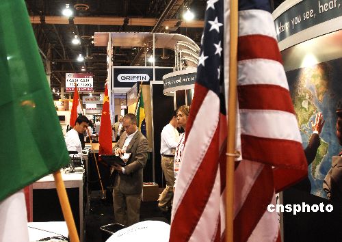 中美合資企業(yè)在展場(chǎng)插起兩國國旗