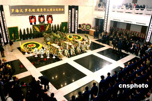 為保護(hù)湖南電網(wǎng)而犧牲的湖南電力公司羅海文、羅長明、周景華三烈士追掉會,1月30日在長沙陽明山殯儀館舉行,上千群眾前往悼念。湖南省委常委、長沙市委書記陳潤兒,省人大常委會副主任陳叔紅,省人民政府副省長陳肇雄,省政協(xié)副主席陽寶華,省軍區(qū)副政委萬建華等省領(lǐng)導(dǎo)前往悼念。圖為湖南各界沉痛悼念抗冰保電的三位烈士。中新社發(fā) 殷中民 攝