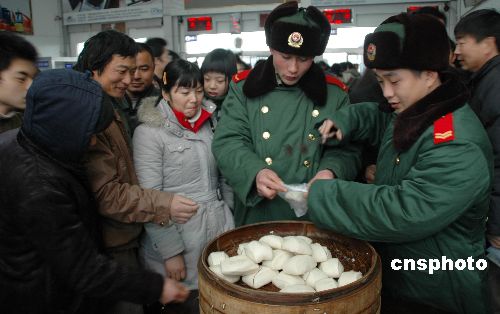1月31日中午,武警浙江省臺州市消防支隊戰(zhàn)士孫嘉飛和曹敏抬著200余只熱饅頭,來到臺州市客運總站,送給因雨雪天氣滯留在車站的旅客。連日來,消防戰(zhàn)士們送免費餐的忙碌身影活躍在臺州各縣市車站。中新社發(fā) 朱叢義 攝