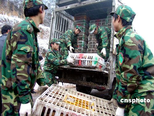 半個多月的凝凍天氣,使貴州清鎮(zhèn)麥格鄉(xiāng)小谷隴村村萬余只成熟肉雞難以運出。1月31日,該市人民武裝部的應(yīng)急民兵緊急出動,幫助村民及時將肉雞運往收購地點。中新社發(fā) 申時進 攝