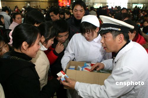 持續(xù)的大范圍災(zāi)害性雨雪天氣給回鄉(xiāng)過春節(jié)的旅客帶來不便。2月5日,中國海軍上海保障基地派出醫(yī)療隊,冒著嚴寒來到上;疖囌久赓M為旅客送醫(yī)送藥。中新社發(fā) 穆東祥 攝