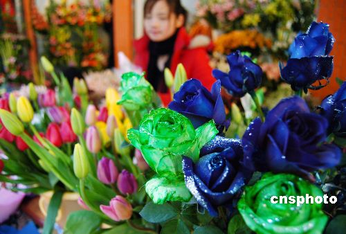 二月十三日,西方情人節(jié)將至,僑鄉(xiāng)泉州城大大小小花店迎來銷售高潮,由昆明引進(jìn)的五彩玫瑰尤其受到僑鄉(xiāng)青年的青睞。中新社發(fā) 傅丹丹 攝