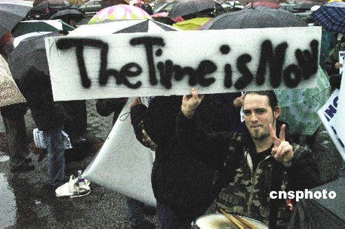 3月19日是美國(guó)對(duì)伊開戰(zhàn)五周年日。在美國(guó)紐約多個(gè)反戰(zhàn)組織以集會(huì)游行的方式要求政府結(jié)束伊戰(zhàn)。圖為在紐約的一個(gè)反戰(zhàn)集會(huì)上,一名美國(guó)青年一手比劃著和平的標(biāo)志,一手舉著標(biāo)語(yǔ)牌,上面寫著:(撤軍的)時(shí)間就是現(xiàn)在。中新社發(fā) 鄧悅 攝