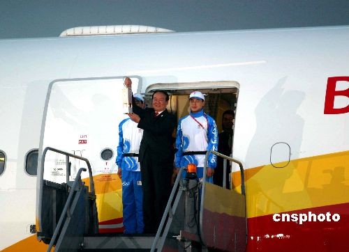 4月5日晚7時(shí)25分,載有北京奧運(yùn)祥云圣火的“奧運(yùn)圣火號”飛抵英國首都倫敦。倫敦人對圣火的到來極為重視,奧運(yùn)事務(wù)大臣等重要官員悉數(shù)抵達(dá)機(jī)場迎接。圖為北京奧組委執(zhí)行副主席蔣效愚(中)手提圣火燈走下飛機(jī)。 中新社發(fā) 沈晨 攝