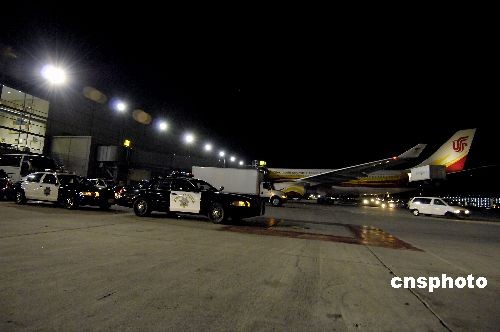 北京奧運圣火自巴黎起飛后順利抵達美國舊金山國際機場,美方派出警力守護。作者: 陳鋼