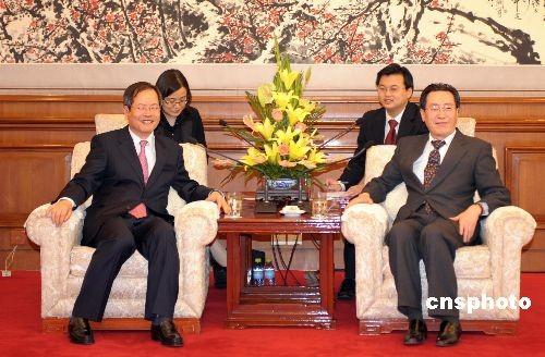 四月九日,朝核問題六方會談中方團長武大偉在北京釣魚臺國賓館會晤韓方代表團團長千英羽。中新社發(fā) 廖攀 攝