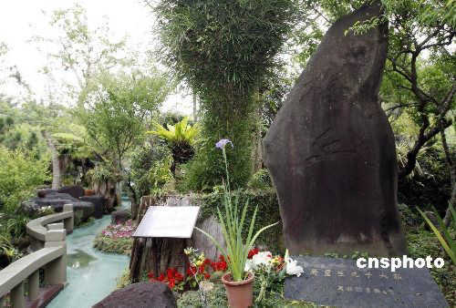 后園內(nèi)豎有一塊狀似臺(tái)灣地圖的巨石,是大千先生客居美國(guó)洛杉磯時(shí)在海灘上發(fā)現(xiàn)的,視為珍寶,題刻“梅丘”。巨石腳下,有張群題刻的青石:“大千先生靈厝”,一代國(guó)畫大師即長(zhǎng)眠于此。中新社發(fā) 杜洋 攝