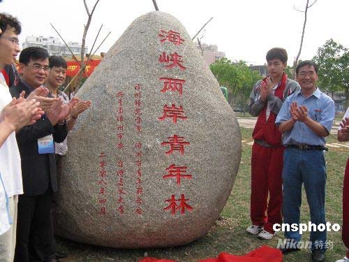 四月十日,在福建漳州師范學院逸夫圖書館前,臺灣嘉義大學和漳州師范學院兩校學生共植“兩岸青年林”,共祝兩岸大學生友誼之樹長青。中新社發(fā) 沈逸亭 攝