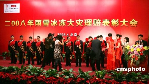 中國人民財(cái)產(chǎn)保險(xiǎn)股份有限公司(PICC)在北京舉行2008年雨雪冰凍大災(zāi)理賠表彰大會,對該公司在此次大災(zāi)理賠工作中取得突出成績的單位(集體)和個(gè)人進(jìn)行表彰。中新社發(fā) 楊可佳 攝