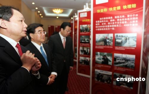 中國保監(jiān)會(huì)副主席周延禮(中)與中國人保集團(tuán)總裁、人保財(cái)險(xiǎn)董事長吳焰(左),中國人保集團(tuán)副總裁、人保財(cái)險(xiǎn)總裁王毅共同觀看展示人保財(cái)險(xiǎn)(PICC)在雨雪冰凍災(zāi)害理賠工作的展板。中新社發(fā) 楊可佳 攝