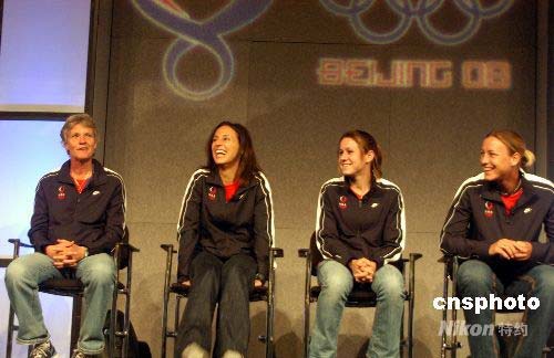 4月14日,兩次奪得奧運(yùn)金牌的美國女子足球隊(duì)主要成員在芝加哥美國奧運(yùn)代表團(tuán)新聞峰會上表示,北京奧運(yùn)會的主要目標(biāo)是奪冠。圖為去年年底剛上任的美國女足主教練皮亞(左一),前鋒凱特·馬克格拉芙(左二),后衛(wèi)奧雷利(右二)、前鋒阿比·邁巴赫(右一)。 作者: 李靜