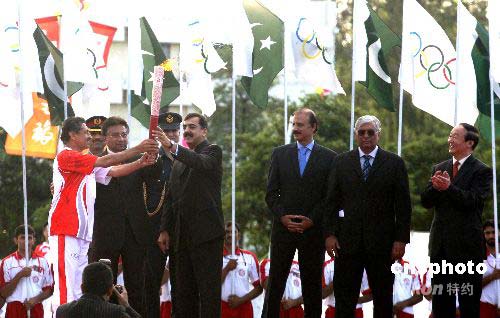 4月16日下午5時,巴基斯坦曲棍球隊前隊長義夫拉·汗從巴基斯坦總統(tǒng)穆沙拉夫和總理吉拉尼兩人手中接過第一棒“祥云”火炬,北京奧運圣火開始在巴基斯坦首都伊斯蘭堡傳遞。圖為巴基斯坦總統(tǒng)穆沙拉夫(左三)、總理吉拉尼(左五)與義夫拉·(左一)三人共舉火炬。作者: 沈晨