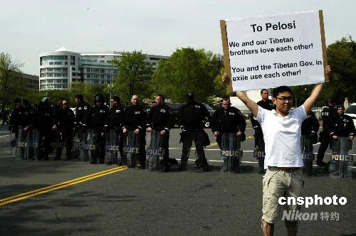當(dāng)?shù)貢r間4月19日,近千名中國留學(xué)生和當(dāng)?shù)氐娜A僑華人在美國國會山前舉行示威活動,支持北京奧運(yùn),反對CNN丑化中國人的評論。圖為一名留學(xué)馬里蘭大學(xué)攻讀機(jī)械工程博士的中國學(xué)生獨(dú)自一人舉著抗議佩洛西的牌子,在眾多警察人墻外示威。 中新社發(fā) 邱江波 攝